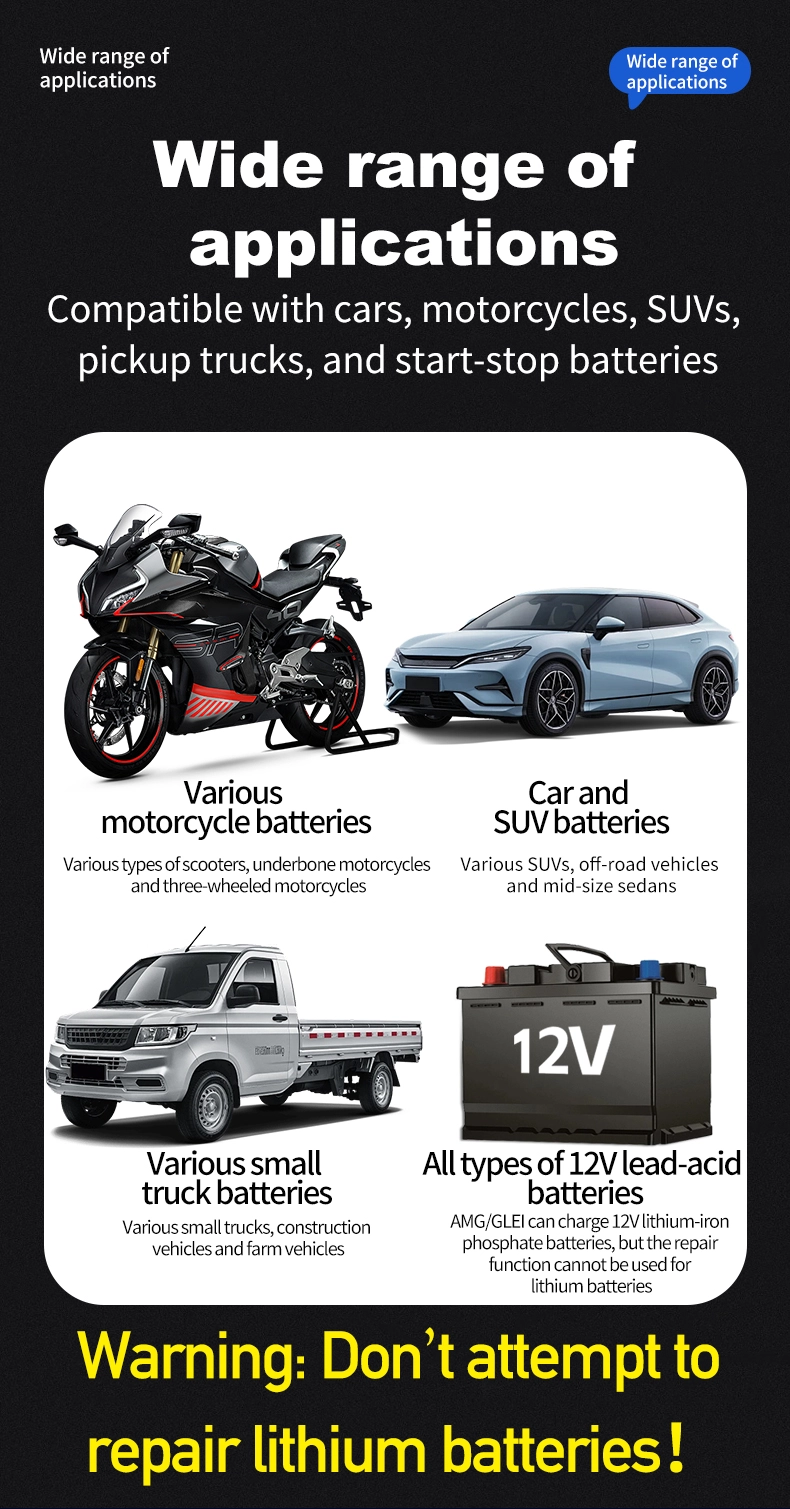 1. యూనివర్సల్ కంపాటబిలిటీ & మల్టీ-బ్యాటరీ సపోర్ట్: ఇది లెడ్-యాసిడ్, AGM, జెల్ మరియు LiFePO4తో సహా అన్ని 12V బ్యాటరీ రకాలతో సజావుగా పనిచేస్తుంది, 6Ah నుండి 180Ah వరకు బ్యాటరీ సామర్థ్యాలను కవర్ చేస్తుంది. 110~230V విస్తృత ఇన్పుట్ శ్రేణి ప్రాంతీయ పరిమితులను తొలగిస్తుంది, ఇది ప్రపంచవ్యాప్తంగా 100కి పైగా దేశాలు మరియు ప్రాంతాలలో ఉపయోగపడేలా చేస్తుంది.