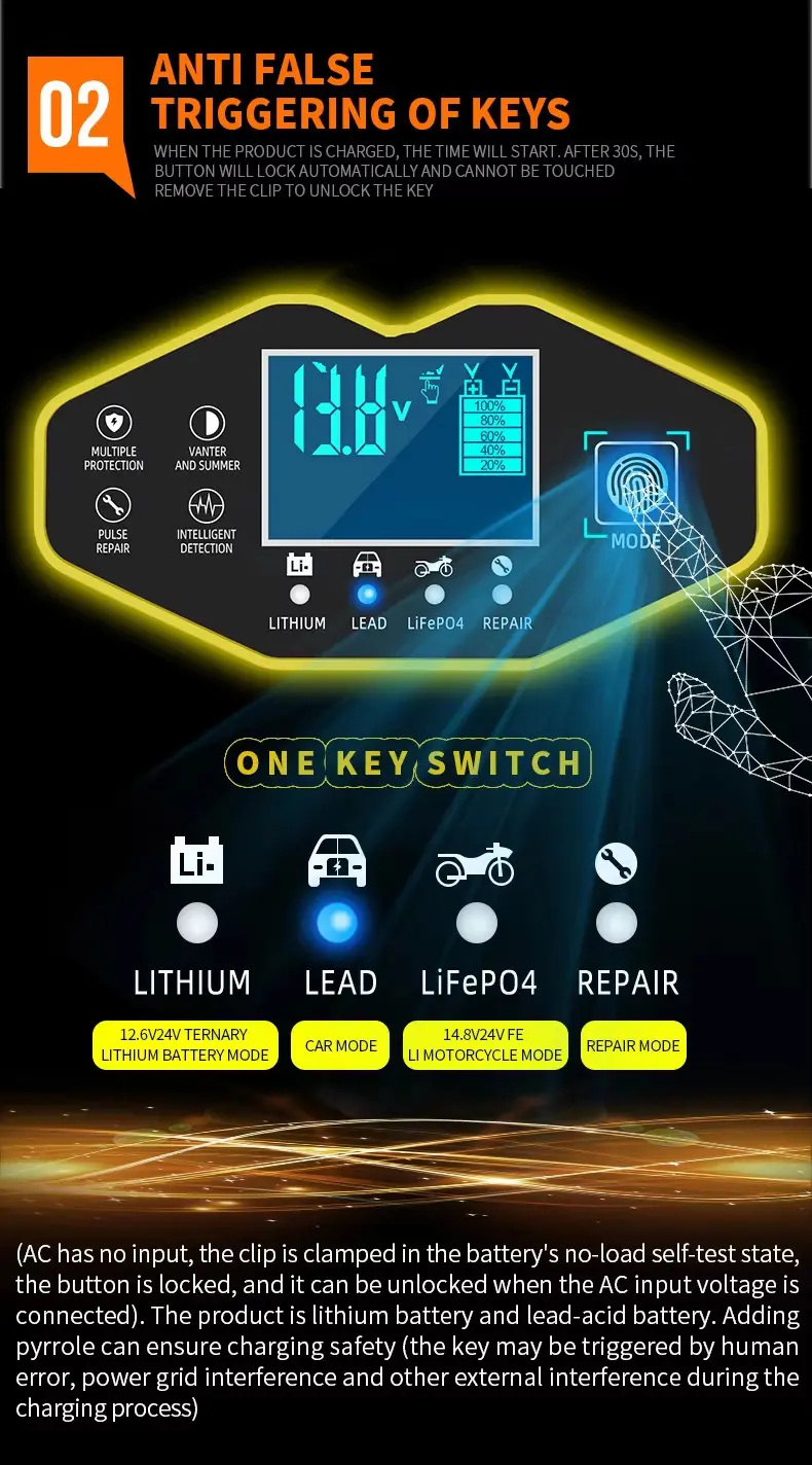1. స్మార్ట్ & అనుకూలమైనది ZYX-J40 లీడ్-యాసిడ్, AGM, జెల్, EFB, Li-ion మరియు LiFePO₄ (లిథియం ఐరన్ ఫాస్ఫేట్)తో సహా మార్కెట్లోని దాదాపు ప్రతి బ్యాటరీ రకానికి మద్దతు ఇస్తుంది. 2Ah నుండి 150Ah వరకు విస్తృత సామర్థ్య పరిధితో, ఇది చిన్న మోటార్సైకిల్ బ్యాటరీల నుండి పెద్ద కార్ బ్యాటరీల వరకు ప్రతిదీ నిర్వహిస్తుంది.