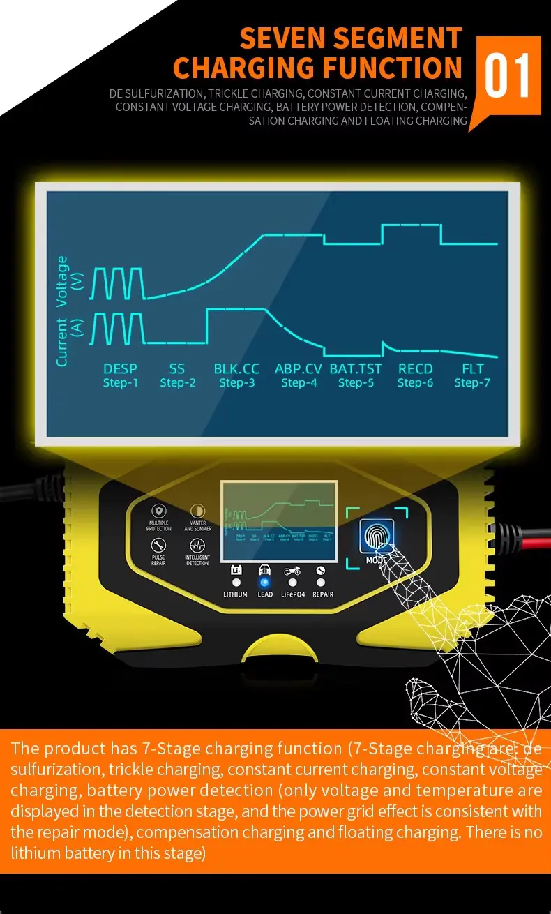 7-దశల ఛార్జింగ్ ప్రోగ్రామ్ సరైన బ్యాటరీ సంరక్షణను నిర్ధారిస్తుంది: డీసల్ఫేషన్, సాఫ్ట్ స్టార్ట్, బల్క్ ఛార్జింగ్, శోషణ, విశ్లేషణ, రీకండీషనింగ్ మరియు ఫ్లోట్ మెయింటెనెన్స్. ఈ దశలు బ్యాటరీ జీవితాన్ని పొడిగించడానికి, సల్ఫేట్ బ్యాటరీలను పునరుద్ధరించడానికి మరియు అధిక ఛార్జింగ్ను నిరోధించడానికి కలిసి పని చేస్తాయి.