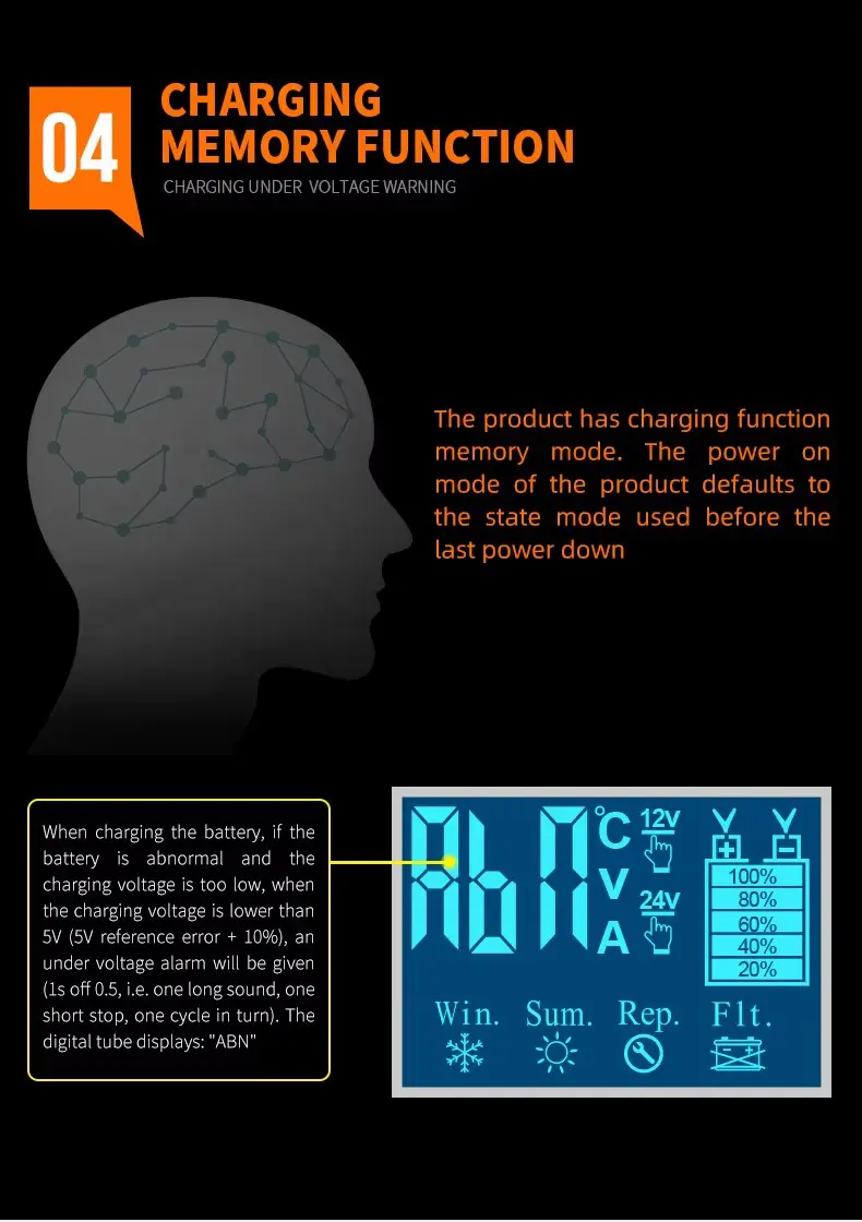 2. ఆప్టిమైజ్ చేసిన ఛార్జింగ్ పనితీరు ఈ ఛార్జర్ 6A వద్ద 12V మరియు 3A వద్ద 24Vని అందిస్తుంది, గరిష్టంగా 110W అవుట్పుట్ మరియు పూర్తి లోడ్లో 85% ఛార్జింగ్ సామర్థ్యాన్ని అందిస్తుంది. ఆటోమేటిక్ 7-దశల స్మార్ట్ ఛార్జింగ్ ప్రోగ్రామ్లో డీసల్ఫేషన్, సాఫ్ట్ స్టార్ట్, బల్క్ ఛార్జింగ్, శోషణ, విశ్లేషణ, రీకండీషనింగ్ మరియు ఫ్లోట్ మెయింటెనెన్స్ ఉన్నాయి. ప్రత్యేకమైన వింటర్ మోడ్ చల్లని ఉష్ణోగ్రతలలో సురక్షితమైన ఛార్జింగ్ని నిర్ధారిస్తుంది, అయితే LCD డిస్ప్లే ఛార్జ్ వోల్టేజ్, కరెంట్ మరియు బ్యాటరీ ఉష్ణోగ్రతను నిజ సమయంలో పర్యవేక్షించడానికి మిమ్మల్ని అనుమతిస్తుంది.