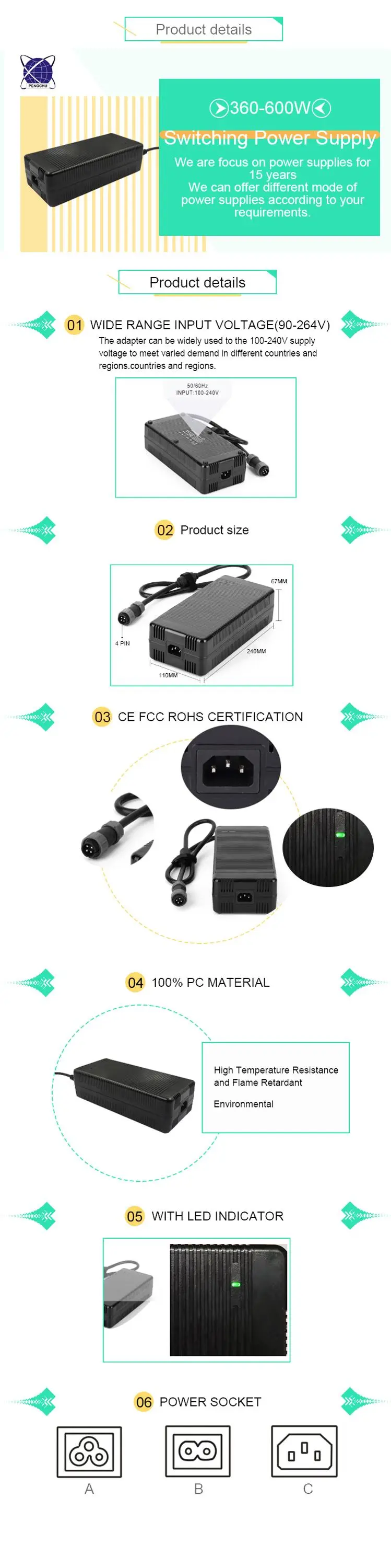 ఈ ఉత్పత్తి యొక్క ప్రధాన ప్రయోజనం దాని శక్తివంతమైన అవుట్పుట్ సామర్థ్యంలో ఉంది: 12V 50A 600W స్విచింగ్ పవర్ సప్లై అడాప్టర్ 600 వాట్ల వరకు నిరంతర మరియు స్వచ్ఛమైన శక్తిని అందించగలదు, మీ సిస్టమ్ పూర్తి లోడ్లో కూడా స్థిరంగా పనిచేస్తుందని నిర్ధారిస్తుంది. మీరు ఎక్కడ ఉన్నా, దాని యూనివర్సల్ వోల్టేజ్ 600W స్విచింగ్ పవర్ సప్లై డిజైన్ స్వయంచాలకంగా ప్రపంచవ్యాప్తంగా 90V-264V విస్తృత వోల్టేజ్ పరిధికి అనుగుణంగా ఉంటుంది, అస్థిర వోల్టేజ్ వల్ల కలిగే ఇబ్బందులను పూర్తిగా తొలగిస్తుంది. వినియోగదారు కనెక్షన్ను సులభతరం చేయడానికి, మేము ప్రత్యేకంగా 4-పిన్ దిన్ కనెక్టర్తో 600W పవర్ అడాప్టర్ను రూపొందించాము, ఇది స్థిరమైన ఇంటర్ఫేస్ మరియు అద్భుతమైన పరిచయాన్ని కలిగి ఉంది, ఇది ఇన్స్టాలేషన్ సౌలభ్యం మరియు భద్రతను బాగా పెంచుతుంది.