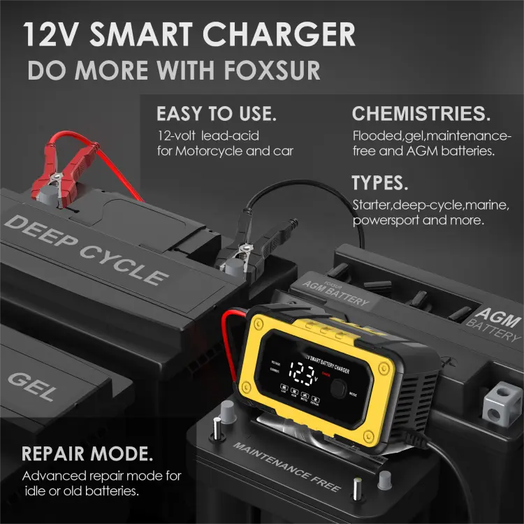 విస్తృత అప్లికేషన్: 12V బ్యాటరీ ఛార్జర్ కార్లు, మోటార్సైకిళ్లు, ATVలు, లాన్ ట్రాక్టర్లు, పడవలు మరియు మరిన్నింటికి అనుకూలంగా ఉంటుంది.