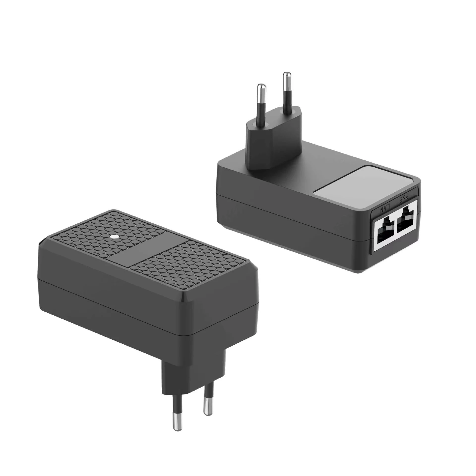 12W వాల్ మౌంట్ ఇంటర్చేంజ్ ప్లగ్ PoE ఇంజెక్టర్ అనేది ఏకీకృత నెట్వర్క్ పవర్ పరికరం, ఇది పవర్ అడాప్టర్ మరియు నిష్క్రియ PoE ఇంజెక్టర్ను ఒకే కాంపాక్ట్ యూనిట్గా మిళితం చేస్తుంది. పవర్ అడాప్టర్ మరియు ఇంజెక్టర్ మాడ్యూల్ రెండూ అవసరమయ్యే సాంప్రదాయ PoE సెటప్ల వలె కాకుండా, ఈ డిజైన్ పరికరాన్ని నేరుగా గోడ సాకెట్లో మౌంట్ చేయడానికి అనుమతించడం ద్వారా సంస్థాపనను సులభతరం చేస్తుంది.