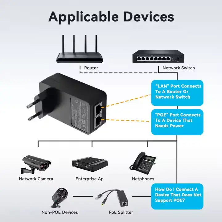 12W POE అడాప్టర్ మార్చుకోగలిగిన ప్లగ్ POE ఇంజెక్టర్ వివిధ నెట్వర్కింగ్ మరియు భద్రతా వాతావరణాలలో విస్తృతంగా ఉపయోగించబడుతుంది: