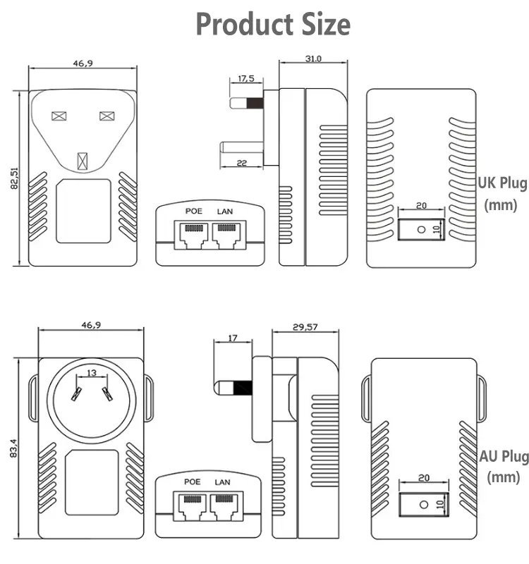 కాంపాక్ట్ వాల్-ప్లగ్ నిర్మాణం ప్రామాణిక పవర్ సాకెట్లతో ప్రత్యక్ష వినియోగాన్ని అనుమతిస్తుంది, అదనపు బ్రాకెట్లు లేదా వైరింగ్ అవసరం లేదు. ఈ 24V 1A 48V 0.5A POE ఇంజెక్టర్ స్థలాన్ని ఆదా చేస్తుంది మరియు కేబులింగ్ను సులభతరం చేస్తుంది, ఇది ఇల్లు, కార్యాలయం, దుకాణం మరియు చిన్న నిఘా వ్యవస్థలకు ఆదర్శవంతమైన ఎంపికగా చేస్తుంది.