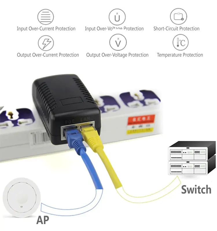2 పోర్ట్ POE ఇంజెక్టర్ తక్కువ అలలతో స్థిరమైన వోల్టేజ్ మరియు కరెంట్ను అందిస్తుంది, దీర్ఘకాలిక స్థిరమైన ఆపరేషన్ను నిర్ధారిస్తుంది. వైడ్ ఇన్పుట్ వోల్టేజ్ 100–240VAC గ్లోబల్ పవర్ గ్రిడ్లకు అనుగుణంగా ఉంటుంది. అంతర్నిర్మిత ఓవర్-వోల్టేజ్, ఓవర్-కరెంట్, షార్ట్-సర్క్యూట్ మరియు ఓవర్-టెంపరేచర్ ప్రొటెక్షన్ డ్యూయల్ పోర్ట్ POE ఇంజెక్టర్ మరియు కనెక్ట్ చేయబడిన పరికరాలు రెండింటినీ రక్షిస్తుంది.