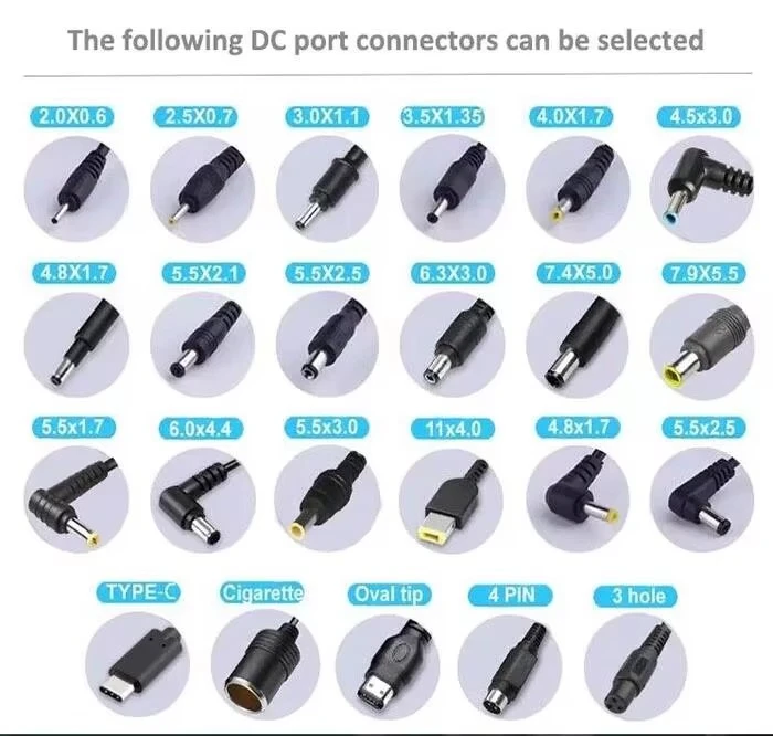 3. కనెక్టర్ అనుకూలత: అడాప్టర్ యొక్క DC అవుట్పుట్ ప్లగ్ మీ పరికరం యొక్క పవర్ జాక్కు సురక్షితంగా సరిపోయేలా సరైన ధ్రువణత (తరచుగా మధ్య-పాజిటివ్) మరియు భౌతిక పరిమాణాన్ని (ఉదా. 5.5 మిమీ x 2.1 మిమీ) కలిగి ఉందని నిర్ధారించండి.