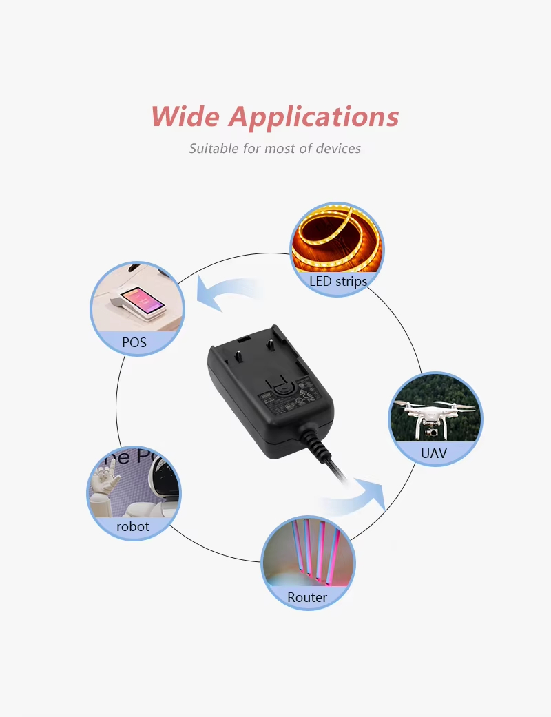 విస్తృత శ్రేణి అప్లికేషన్ దృశ్యాలు: LED లైట్ స్ట్రిప్స్, స్మార్ట్ స్పీకర్లు, నెట్వర్క్ రౌటర్లు లేదా ఇతర చిన్న ఎలక్ట్రికల్ ఉపకరణాలకు శక్తినివ్వడం కోసం అయినా, ఈ శక్తివంతమైన స్విచింగ్ మార్చుకోగలిగిన ప్లగ్ పవర్ సప్లై మీకు అత్యంత ఆదర్శవంతమైన మరియు భరోసా ఇచ్చే ఎంపిక!