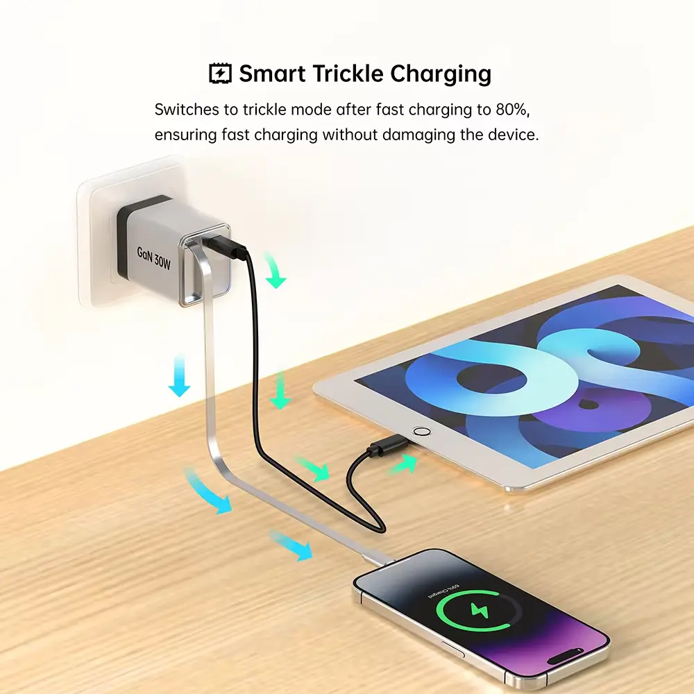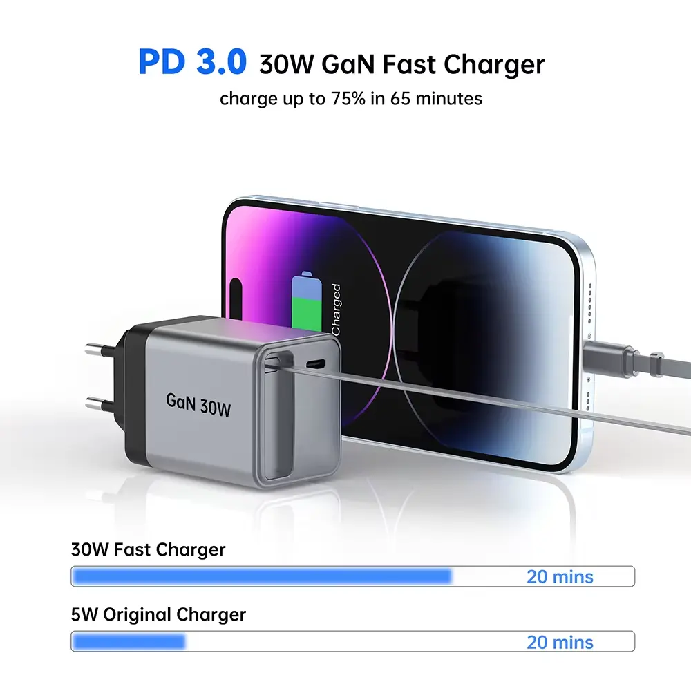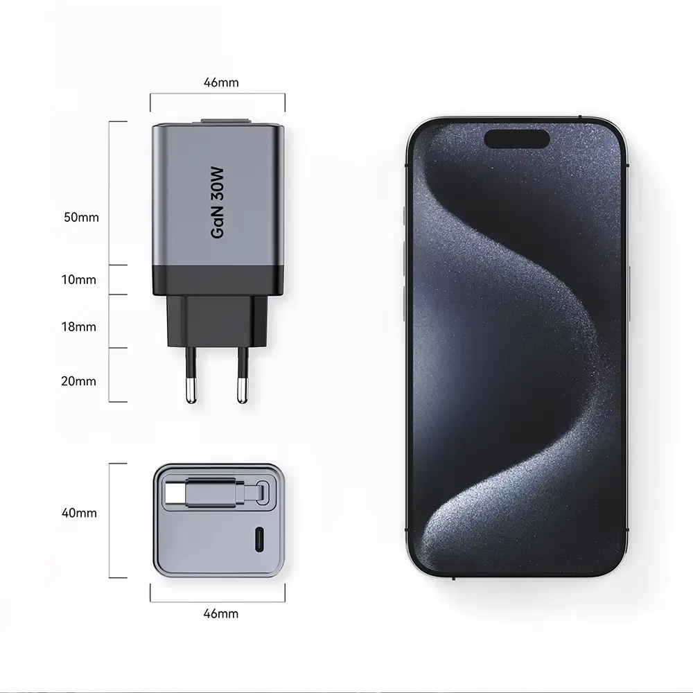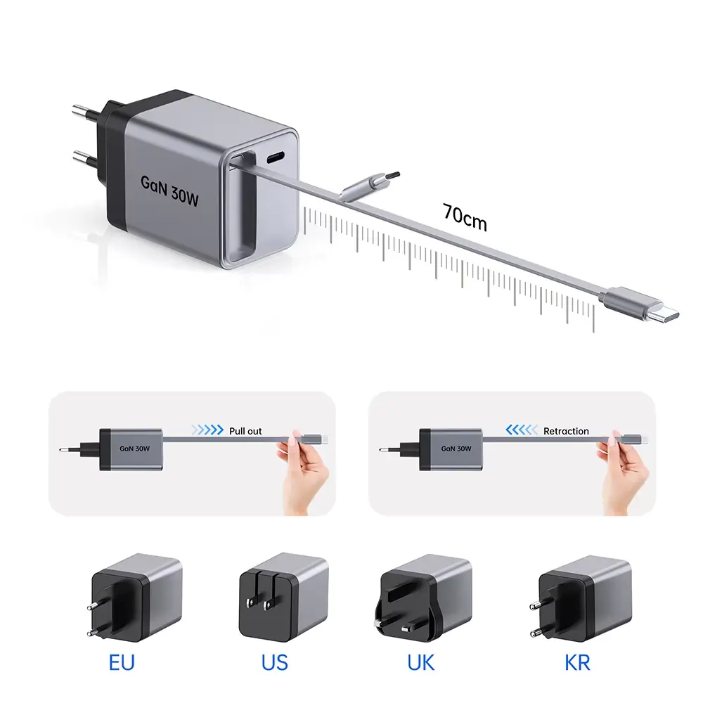 రిట్రాక్టబుల్ టైప్ C కేబుల్తో కూడిన 30W క్విక్ ఛార్జర్ అల్ట్రా-తేలికైన, పాకెట్-పరిమాణ డిజైన్ చుట్టూ తీసుకెళ్లడం సులభం చేస్తుంది. ఇల్లు, కార్యాలయం లేదా ప్రయాణానికి ఇది సరైన ఎంపిక.