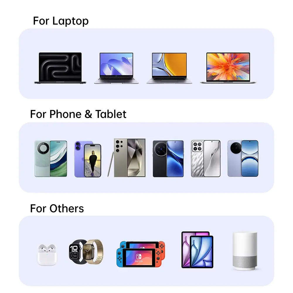 మొబైల్ ఫోన్లు, హెడ్ఫోన్లు మరియు గేమింగ్ ఉపకరణాలతో సహా USB-C పరికరాలకు అనుకూలమైనది. సురక్షితమైన మరియు సమర్థవంతమైన ఛార్జింగ్ కోసం పరికర అవసరాలను స్వయంచాలకంగా గుర్తిస్తుంది. 4.ట్రావెల్-రెడీ పోర్టబిలిటీ