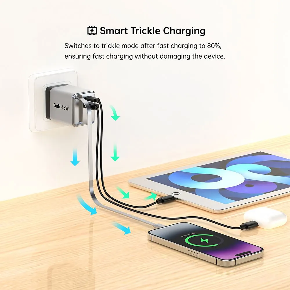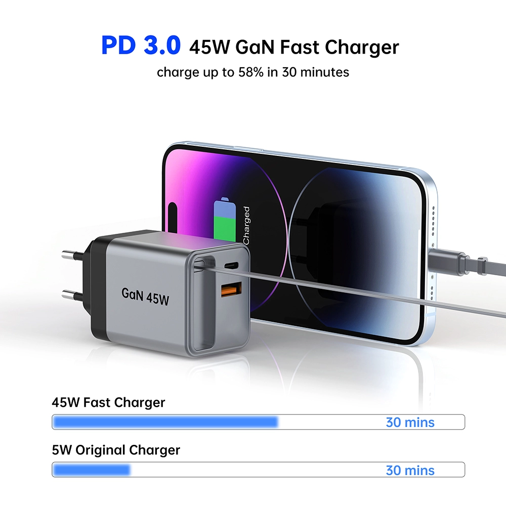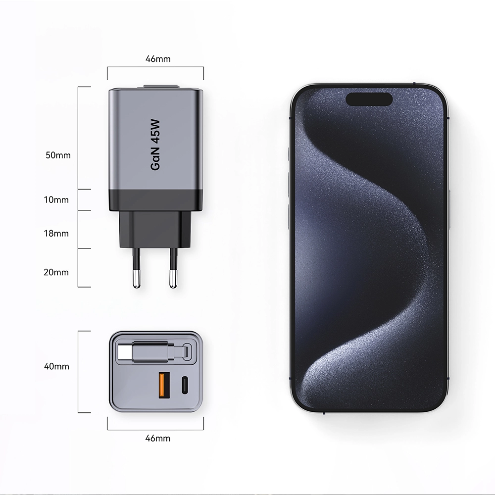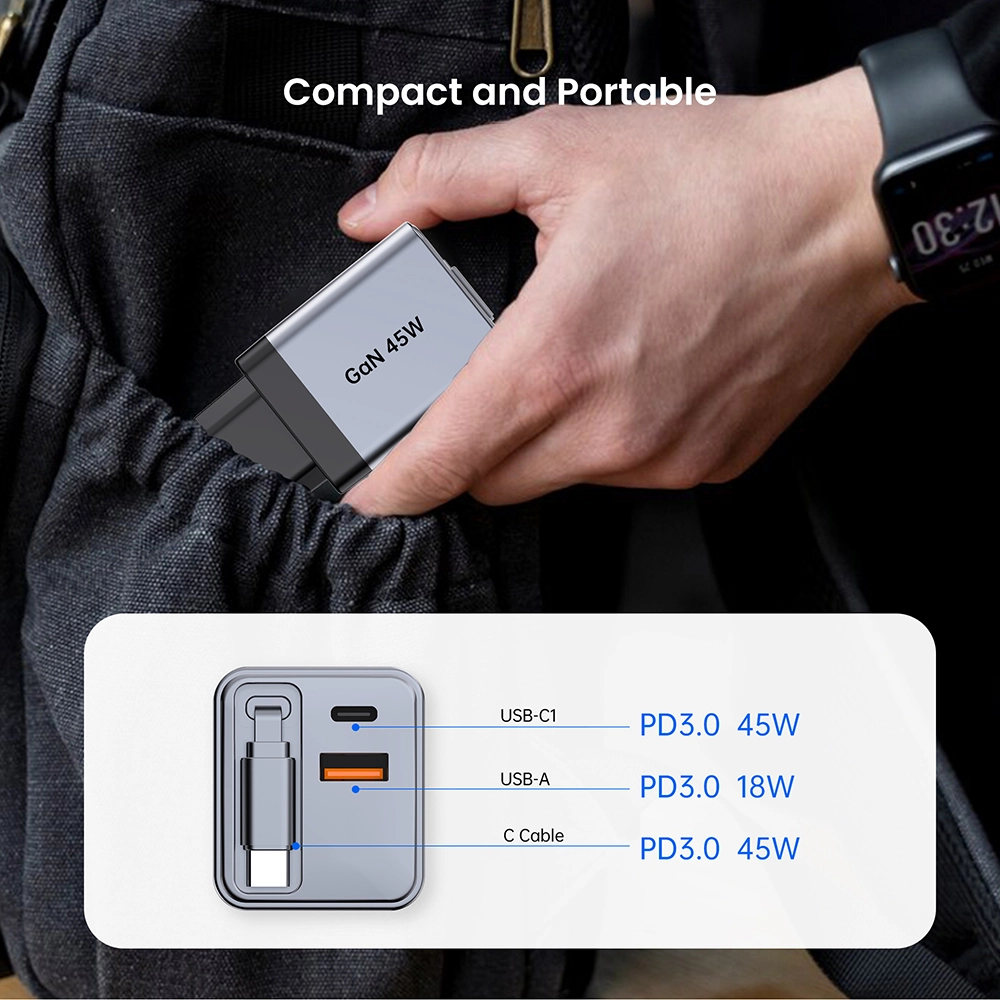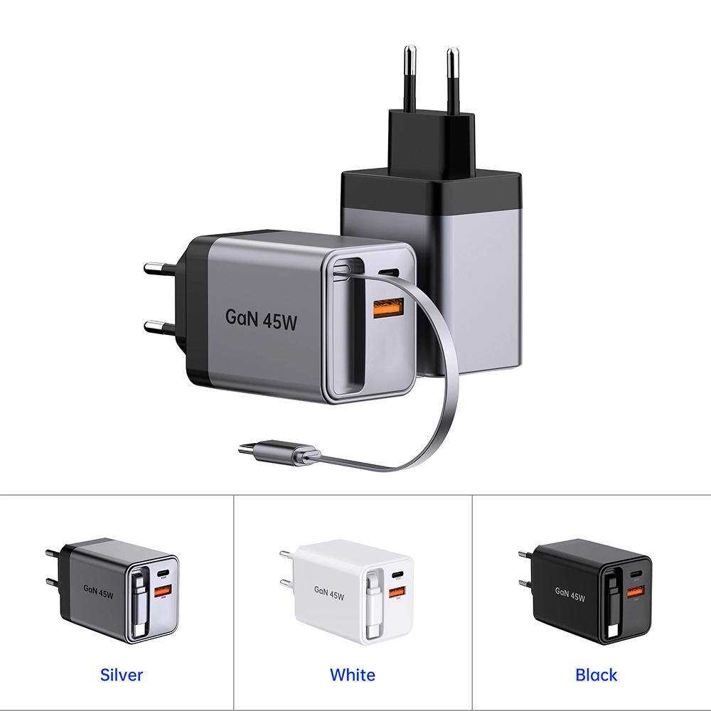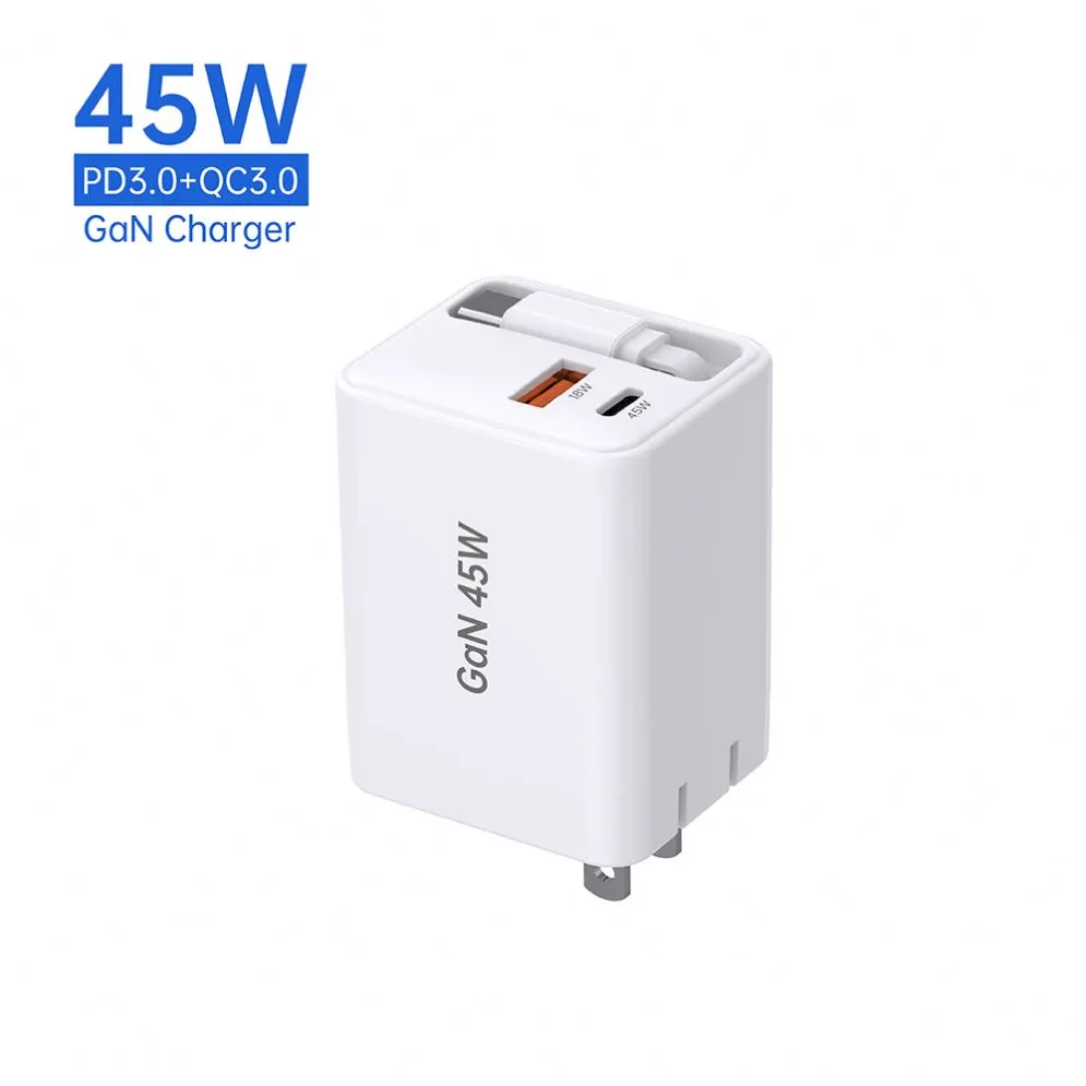 GAN 45W ముడుచుకునే ఫాస్ట్ ఛార్జర్ USB-CABLE+USB-A+USB-C 45W PD ఛార్జర్తో కేబుల్