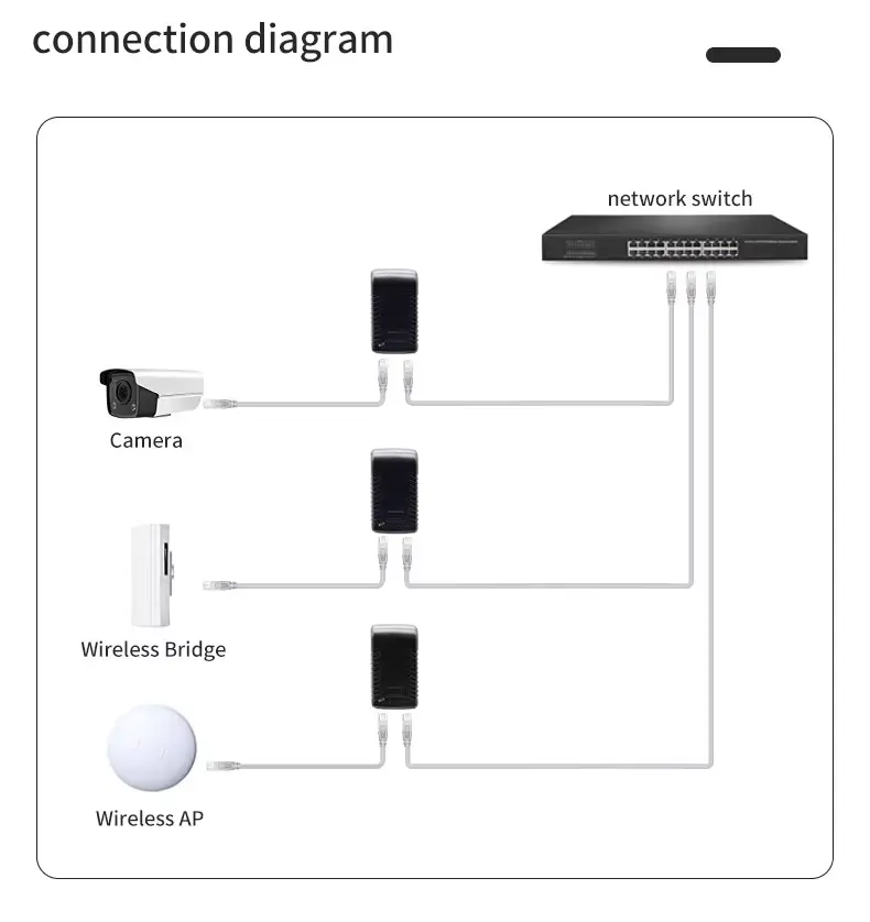 ఈ ఇంజెక్టర్ ప్రత్యేకంగా ఈథర్నెట్ ద్వారా 48V DC ఇన్పుట్ అవసరమయ్యే నెట్వర్కింగ్ పరికరాల కోసం రూపొందించబడింది. ఇది పరిశ్రమ-ప్రామాణిక పరికరాలతో విస్తృతంగా అనుకూలంగా ఉంటుంది, వీటిలో: