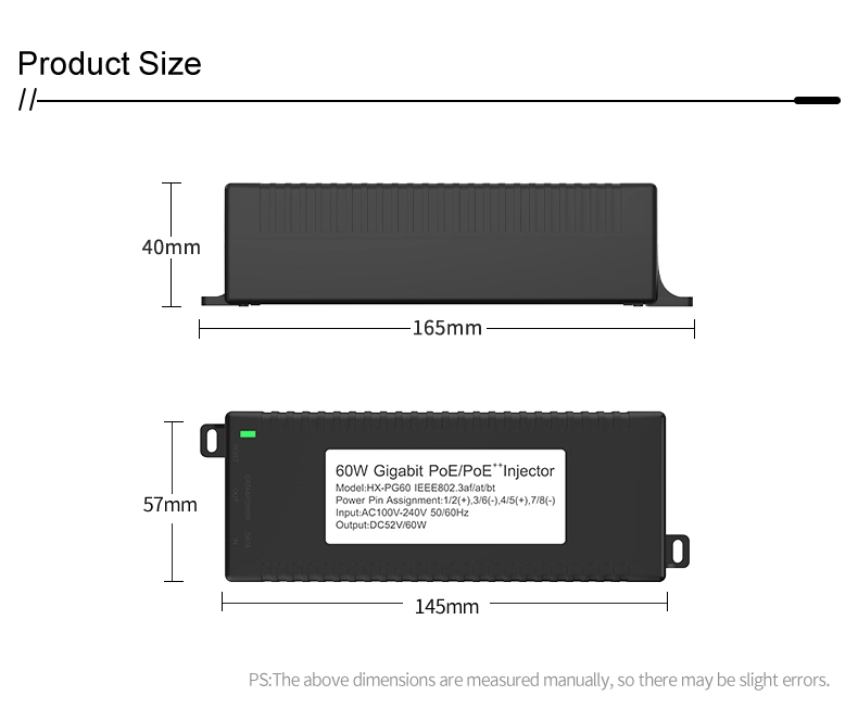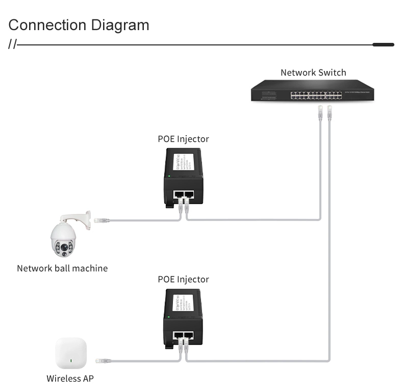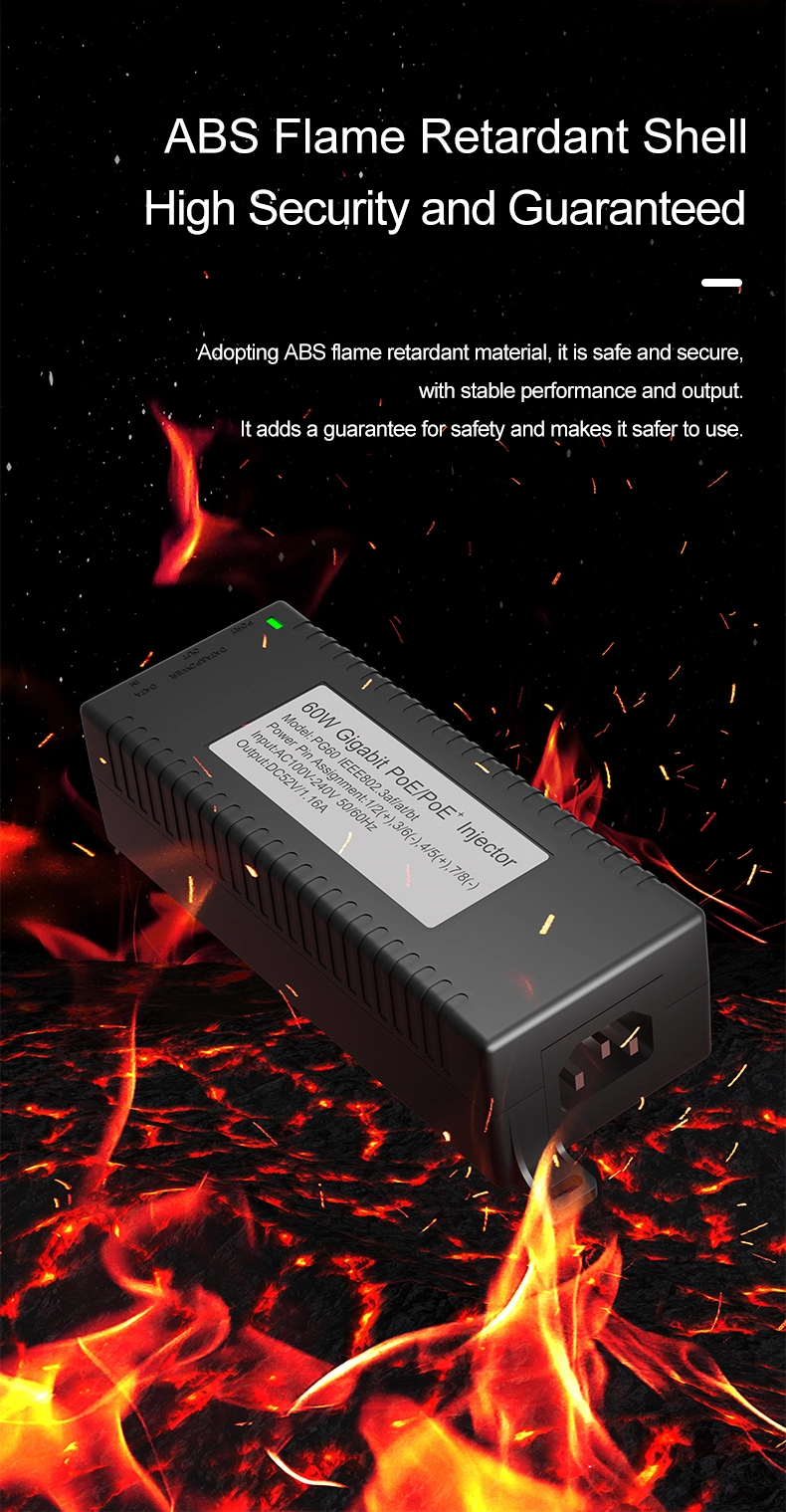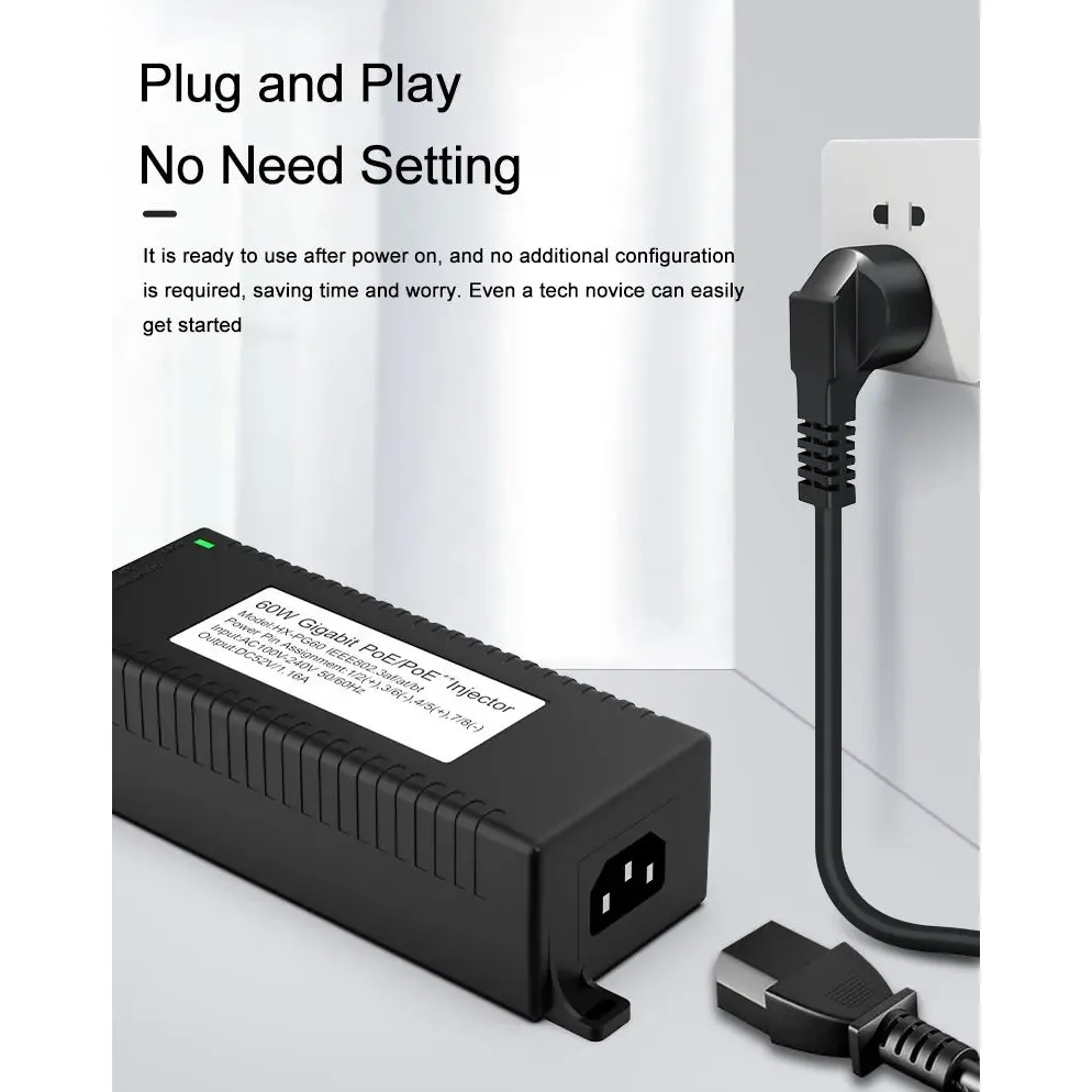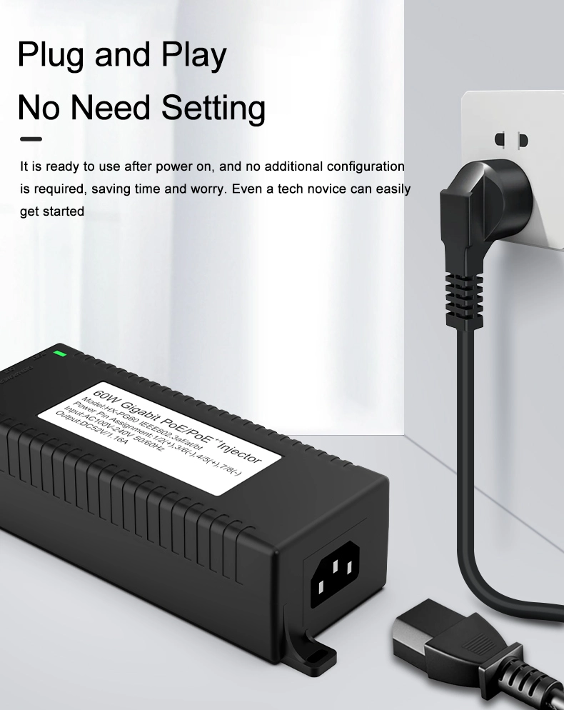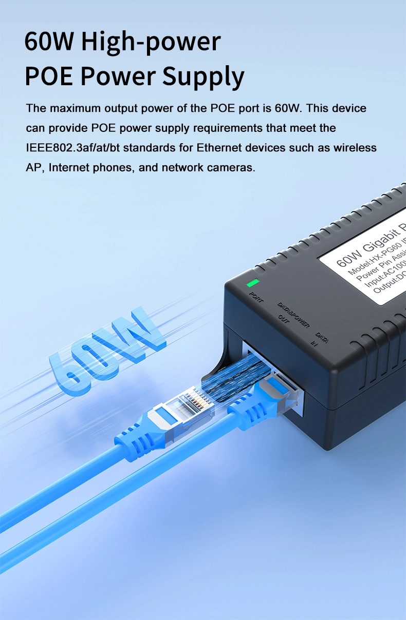 భద్రతా నిఘా: IP కెమెరా భద్రత మరియు నెట్వర్క్ పరికరం కోసం గిగాబిట్ 60W డెస్క్టాప్ POE ఇంజెక్టర్ IP కెమెరాలు మరియు PTZ కెమెరాలకు స్థిరమైన శక్తిని అందిస్తుంది.