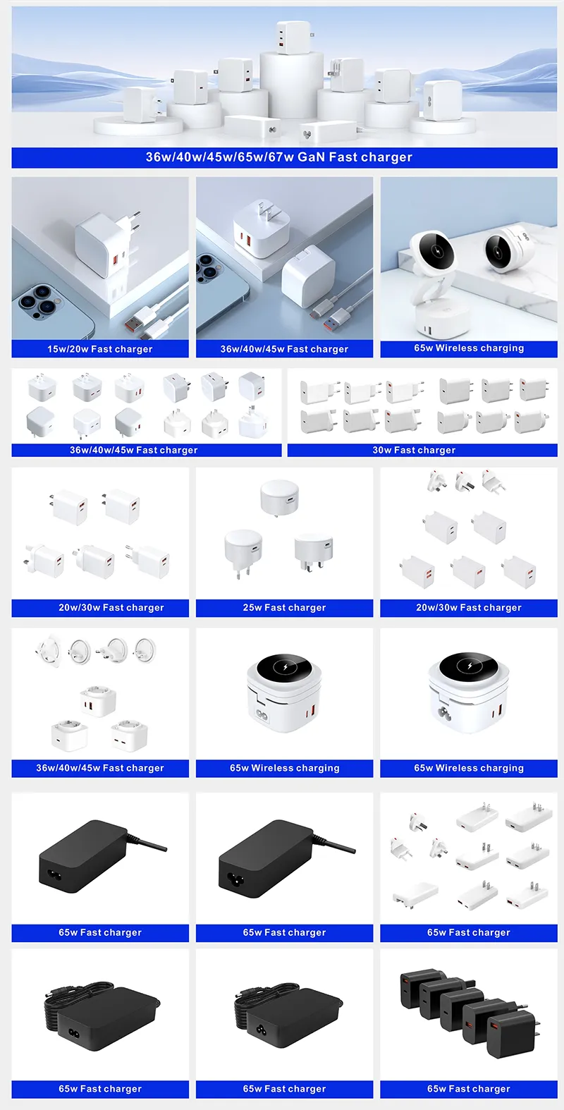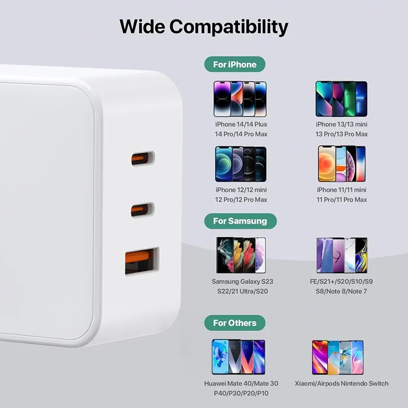 ఈ ఛార్జర్ గరిష్టంగా 65W వరకు స్థిరమైన శక్తిని అందిస్తుంది మరియు ల్యాప్టాప్లను (ఉదా. MacBook Air/Pro, Dell XPS), టాబ్లెట్లు, స్మార్ట్ఫోన్లు (iPhone, Samsung Galaxy) మరియు PD ప్రోటోకాల్కు మద్దతు ఇచ్చే ఇతర పరికరాలను సమర్థవంతంగా ఛార్జ్ చేస్తుంది. దీని కాంపాక్ట్ మరియు తేలికైన డిజైన్ ప్రయాణానికి అనువైనదిగా చేస్తుంది, అయితే అంతర్నిర్మిత ఓవర్వోల్టేజ్, ఓవర్కరెంట్ మరియు షార్ట్-సర్క్యూట్ రక్షణ ఛార్జర్ మరియు కనెక్ట్ చేయబడిన పరికరాల సురక్షిత ఛార్జింగ్ను నిర్ధారిస్తుంది. ఇది సాధారణంగా 1-2 USB-C ఇంటర్ఫేస్లతో అమర్చబడి ఉంటుంది, ఇది ఒకే సమయంలో బహుళ చిన్న పరికరాలను ఛార్జ్ చేయడానికి, శక్తి మరియు సౌలభ్యాన్ని సమతుల్యం చేయడానికి మద్దతు ఇస్తుంది.