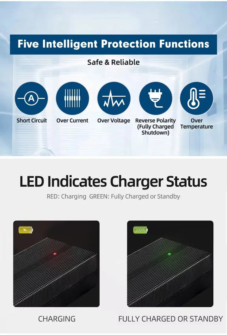 గ్లోబల్ అనుకూలత & బలమైన భద్రత: యూనివర్సల్ 100–240VAC ఇన్పుట్ను కలిగి ఉంది, ఇది ప్రపంచవ్యాప్తంగా సజావుగా పనిచేస్తుంది. అధునాతన మూడు-దశల స్మార్ట్ ఛార్జింగ్ (CC/CV) బ్యాటరీ ఆరోగ్యాన్ని ఆప్టిమైజ్ చేస్తుంది, అయితే సమగ్ర రక్షణలు-షార్ట్ సర్క్యూట్, ఓవర్ వోల్టేజ్, ఓవర్ టెంపరేచర్ మరియు ఓవర్లోడ్-సురక్షితమైన, ఆందోళన-రహిత ఆపరేషన్ను నిర్ధారిస్తుంది. మన్నికైన హౌసింగ్ డిమాండ్ వాతావరణంలో మెరుగైన విశ్వసనీయత కోసం అగ్నిమాపక పదార్థాలతో నిర్మించబడింది.