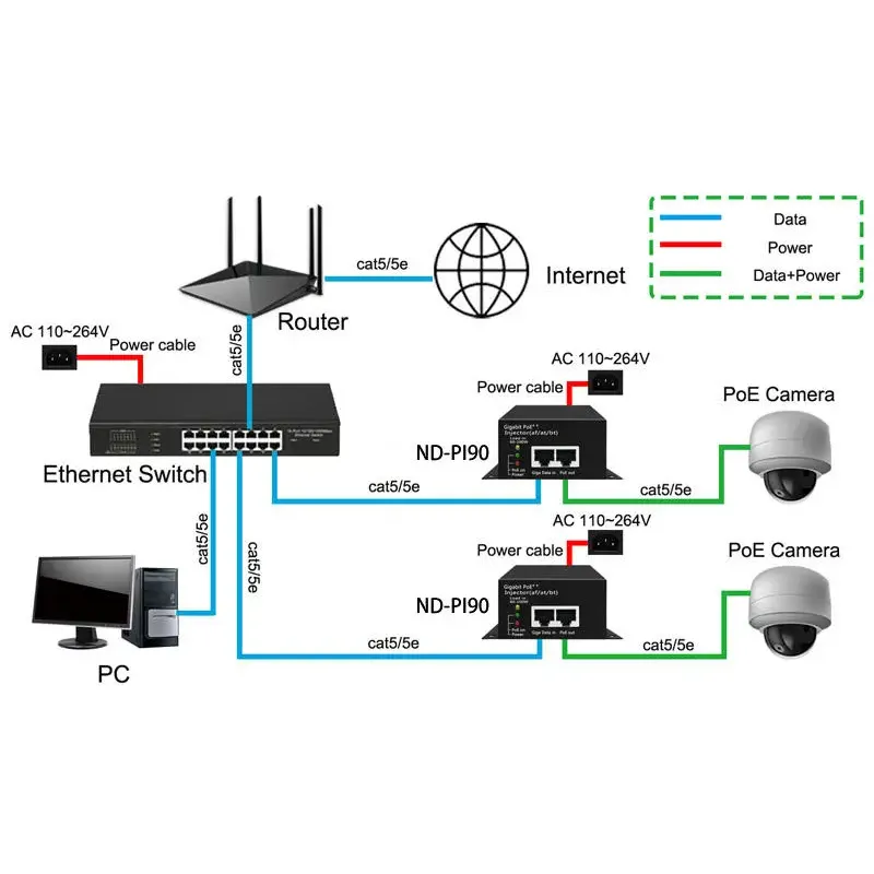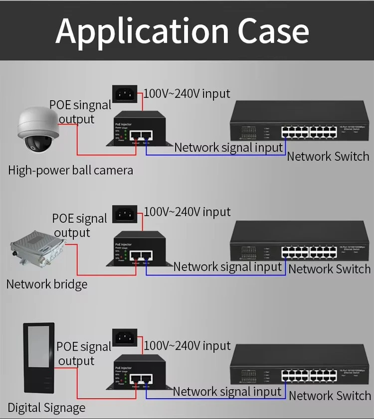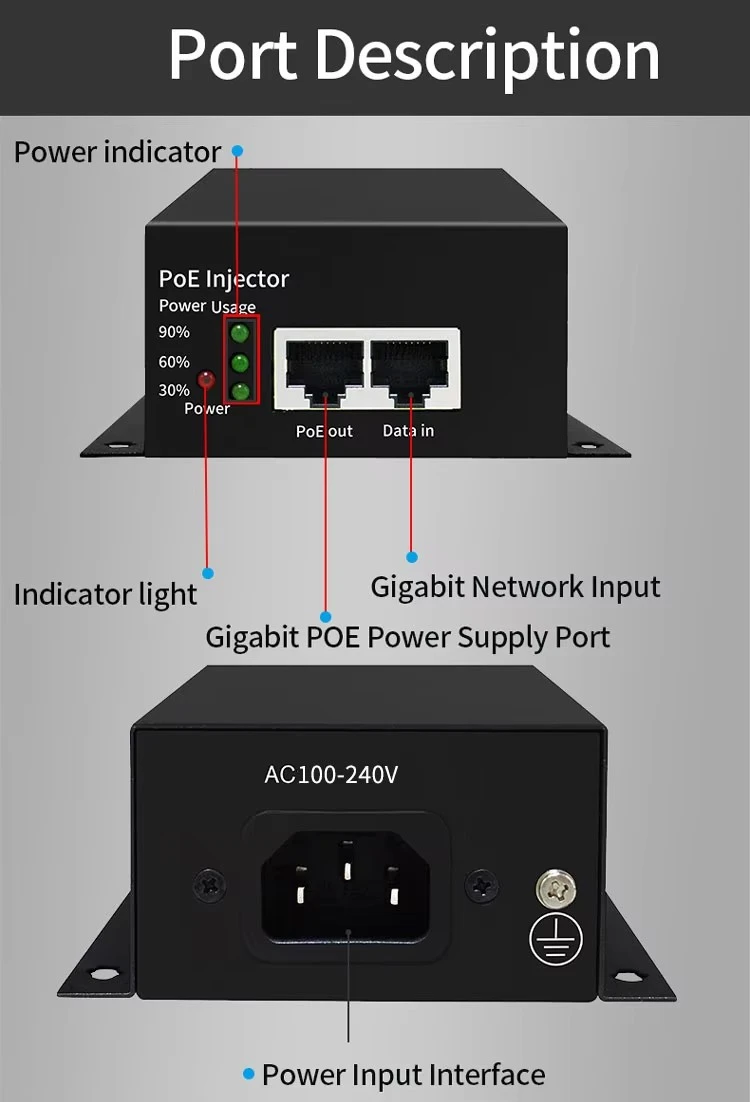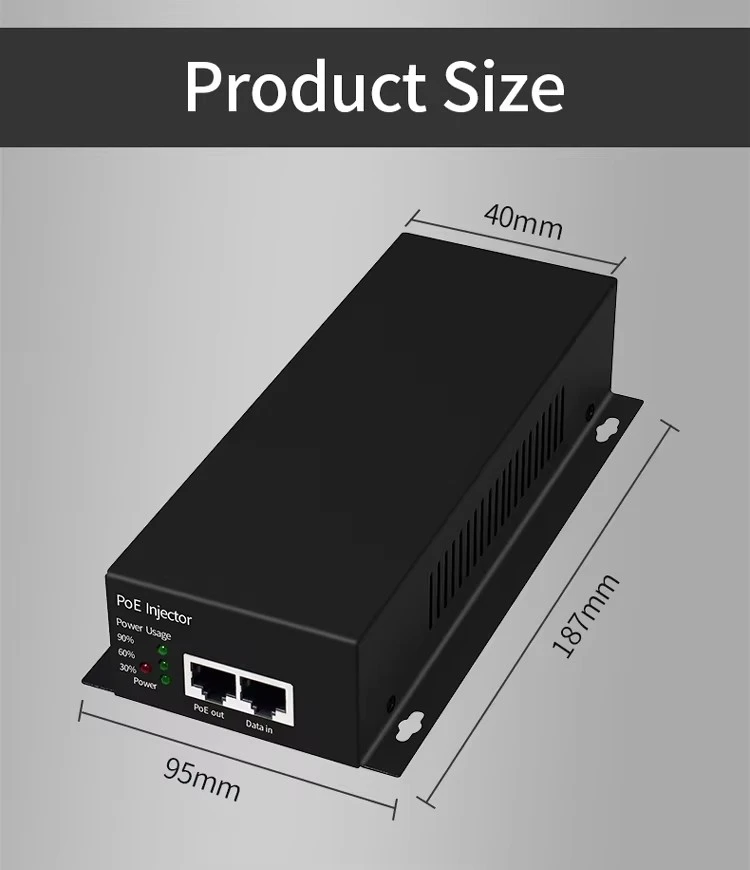 బహుముఖ ప్రజ్ఞ కోసం రూపొందించబడింది, ఈ ఇంజెక్టర్ 802.3af/ఎట్ పరికరాలతో వెనుకకు అనుకూలంగా ఉంది. ఇది PTZ కెమెరాలు, అధిక-పనితీరు గల వైర్లెస్ యాక్సెస్ పాయింట్లు మరియు వీడియో కాన్ఫరెన్సింగ్ పరికరాలను శక్తివంతం చేయడానికి అనువైనది. ఉత్పత్తి సాధారణ ప్లగ్-అండ్-ప్లే సొల్యూషన్ను అందిస్తుంది, అదనపు ఎలక్ట్రికల్ అవుట్లెట్ల అవసరాన్ని తొలగిస్తుంది మరియు ఎంటర్ప్రైజ్ మరియు ఇండస్ట్రియల్ అప్లికేషన్లలో ఇన్స్టాలేషన్ సంక్లిష్టతను తగ్గిస్తుంది.