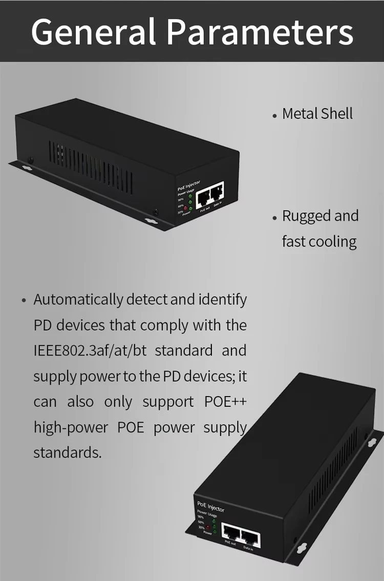 PoE ఉత్పత్తులు ప్రామాణిక PoE, PoE+, PoE++ మరియు వైర్లెస్ AP, నెట్వర్క్ కెమెరా, IP ఫోన్ మరియు ఇతర పరికరాల కోసం స్థిరమైన విద్యుత్ సరఫరా మరియు డేటా ప్రసారాన్ని అందించడానికి, వైరింగ్ను సులభతరం చేయడానికి మరియు ఖర్చులను తగ్గించడానికి ఇతర స్పెసిఫికేషన్లను అందిస్తాయి.