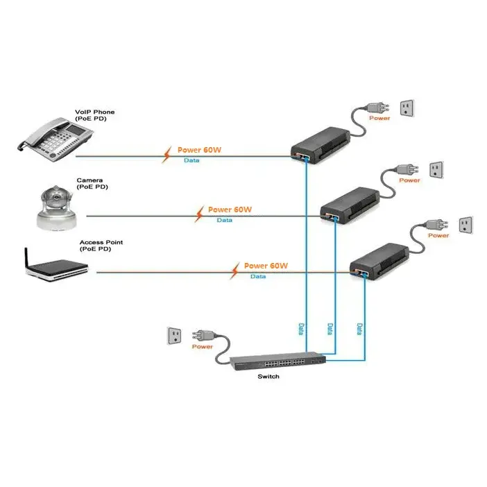 60W వరకు అవుట్పుట్ను అందిస్తుంది మరియు IEEE 802.3bt/at/af ప్రమాణాలకు పూర్తిగా మద్దతు ఇస్తుంది. ఇది తక్కువ-శక్తి పరికరాలు (15.4W) మరియు అధిక-శక్తి పరికరాలు (30W/60W) రెండింటినీ శక్తివంతం చేస్తుంది, దాదాపు అన్ని ఈథర్నెట్-ఆధారిత పరికరాలను కవర్ చేస్తుంది మరియు బలమైన PoE అనుకూలతను నిర్ధారిస్తుంది.