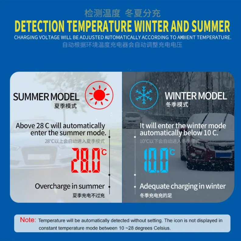 · ఆటో మెయింటెనెన్స్ మోడ్: ట్రికిల్ ఛార్జర్ మరియు దీర్ఘ-కాల బ్యాటరీ మెయింటెయినర్గా విధులు, కాలానుగుణ లేదా అరుదుగా ఉపయోగించే వాహనాలకు అనువైనది.
