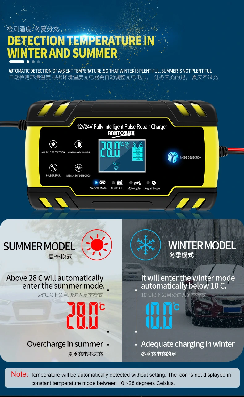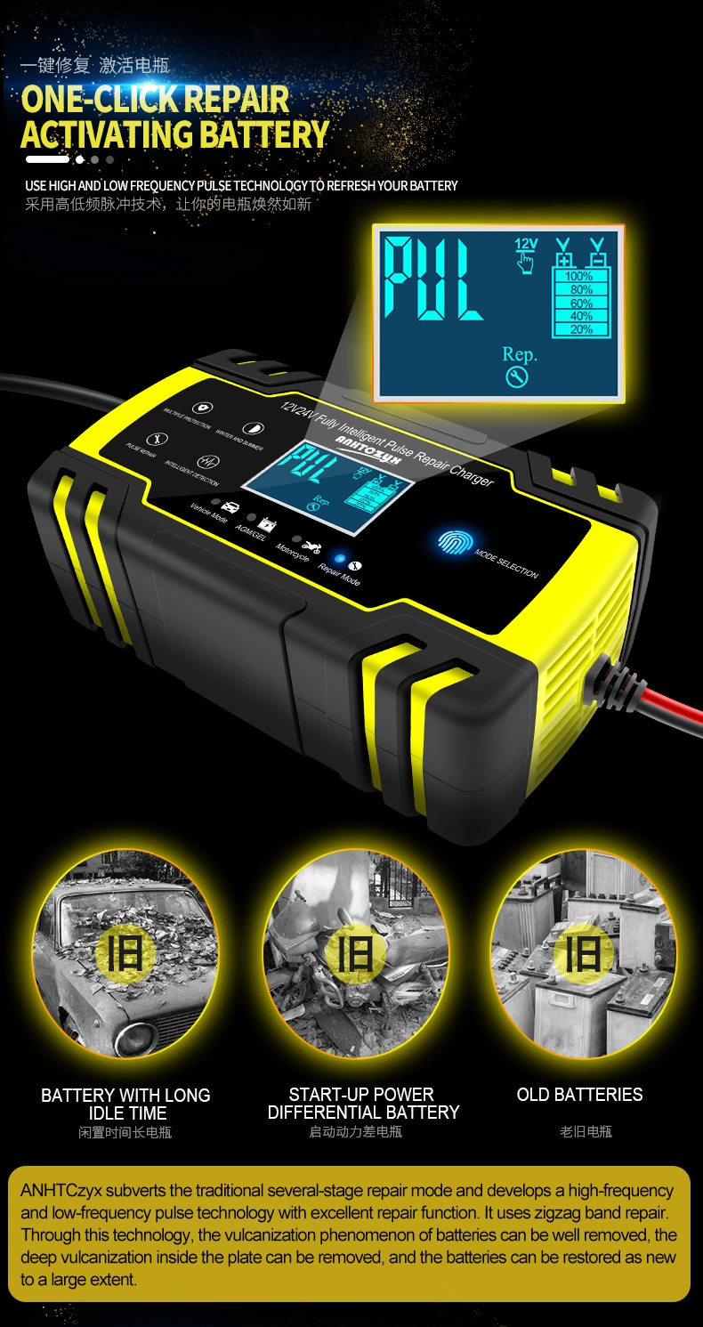 12V 8A ఆటోమేటిక్ పల్స్ agm efb జెల్ బ్యాటరీ ఛార్జర్ లీడ్-యాసిడ్ స్టార్ట్ స్టాప్ కార్ మోటార్సైకిల్ కోసం 3-దశల బ్యాటరీ ఛార్జర్ |