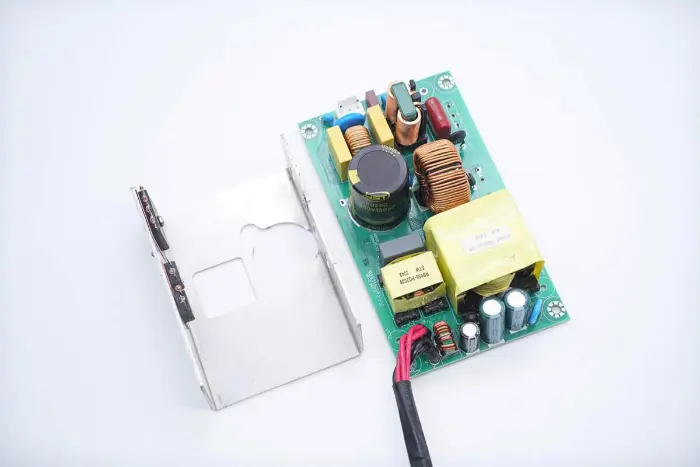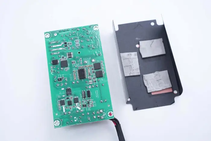 విశ్లేషణ ద్వారా, STARWELL ప్రారంభించిన 300W GaN విద్యుత్ సరఫరా మాడ్యూల్ త్రూ-హోల్ రెక్టిఫైయర్ వంతెనలు మరియు అంతర్గత హీట్ సింక్పై స్థిరపడిన రెక్టిఫైయర్ డయోడ్లను ఉపయోగిస్తుందని కనుగొనబడింది. ప్యాచ్ GaN స్విచ్లు వేడి వెదజల్లడం కోసం దిగువ అల్యూమినియం అల్లాయ్ షెల్కు వేడిని నిర్వహించడానికి థర్మల్ ప్యాడ్లను ఉపయోగిస్తాయి, ఉష్ణ వెదజల్లే సామర్థ్యాన్ని మెరుగుపరుస్తాయి. వేడెక్కుతున్న సందర్భంలో కంట్రోలర్ విద్యుత్ సరఫరాను మార్చడానికి అంతర్గత హీట్ సింక్లో థర్మల్ స్విచ్ వ్యవస్థాపించబడింది, మొత్తం వేడెక్కడం రక్షణను గ్రహించడం.