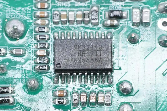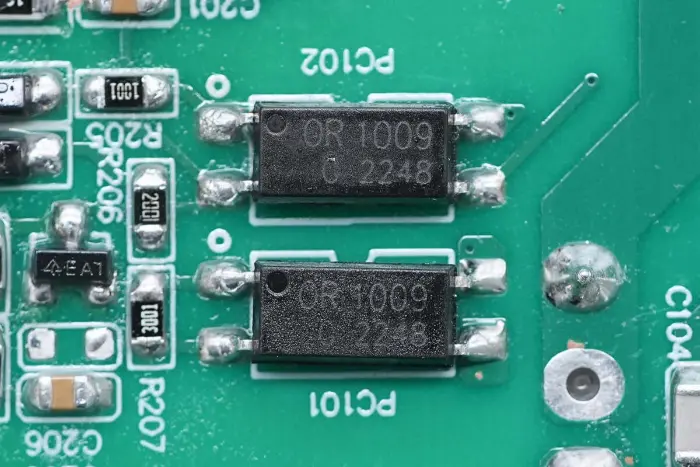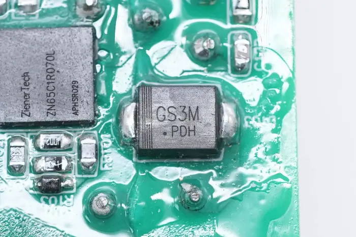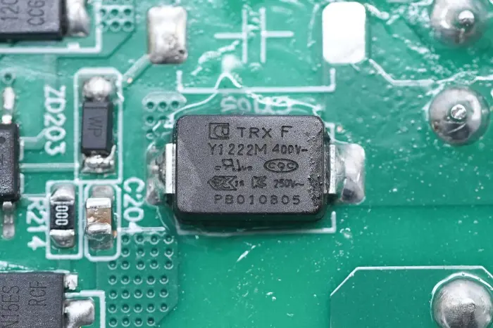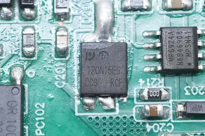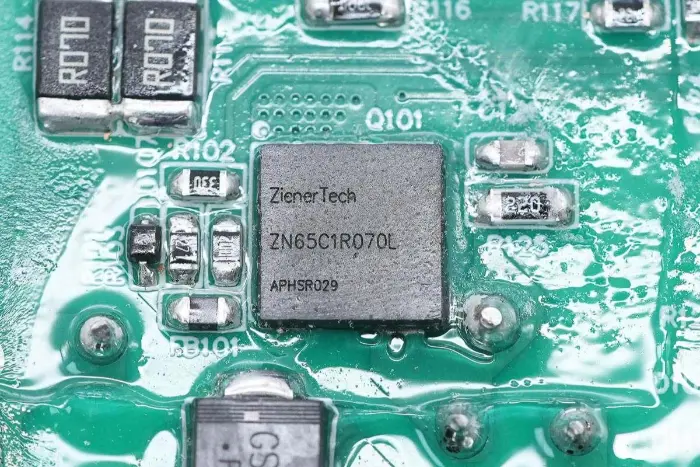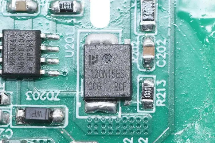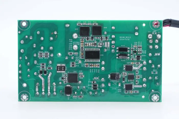 PCBA మాడ్యూల్ వెనుక, 2-in-1 PFC+LLC కంట్రోలర్ ఉంది. PFC స్విచ్ దిగువ ఎడమ వైపున ఉంది, LLC స్విచ్ మెయిన్ కంట్రోల్ చిప్ పైన ఉంది, ఫీడ్బ్యాక్ ఆప్టోకప్లర్ కుడి వైపున ఉంది మరియు సింక్రోనస్ రెక్టిఫైయర్ కంట్రోలర్ మరియు రెండు సింక్రోనస్ రెక్టిఫైయర్లు దిగువన ఉన్నాయి. మొత్తం బోర్డు రక్షణ కోసం కన్ఫార్మల్ పూతతో పూత పూయబడింది.