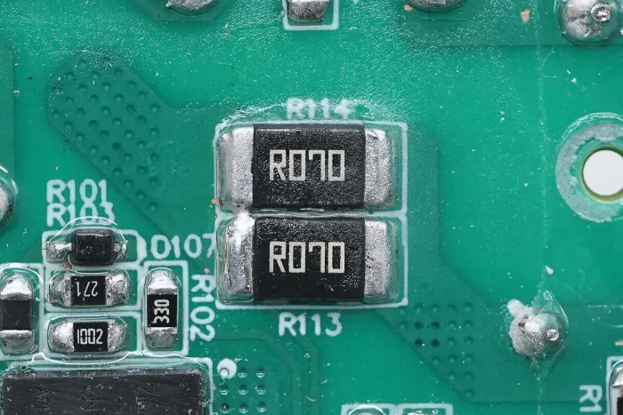 స్విచ్ కరెంట్ను గుర్తించడానికి రెండు 70mΩ రెసిస్టర్లు సమాంతరంగా కనెక్ట్ చేయబడ్డాయి.