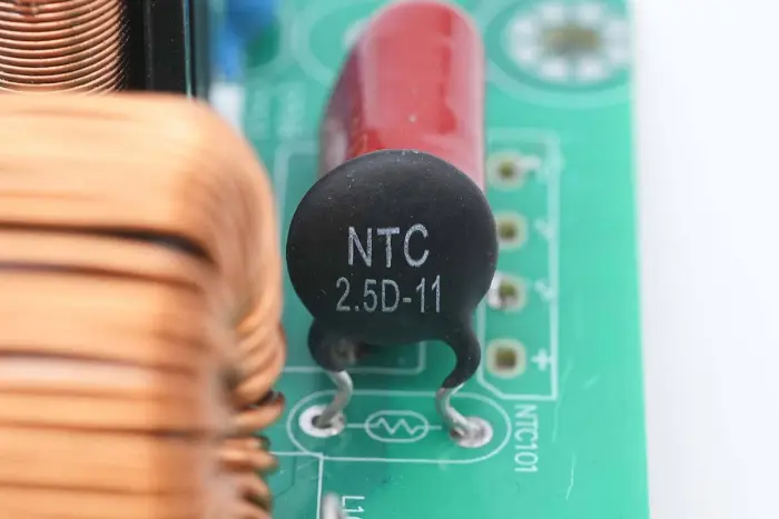 NTC థర్మిస్టర్ 2.5D-11గా గుర్తించబడింది, ఇది అధిక-వోల్టేజ్ ఎలక్ట్రోలైటిక్ కెపాసిటర్ యొక్క ఛార్జింగ్ కరెంట్ను అణిచివేసేందుకు ఉపయోగించబడుతుంది.