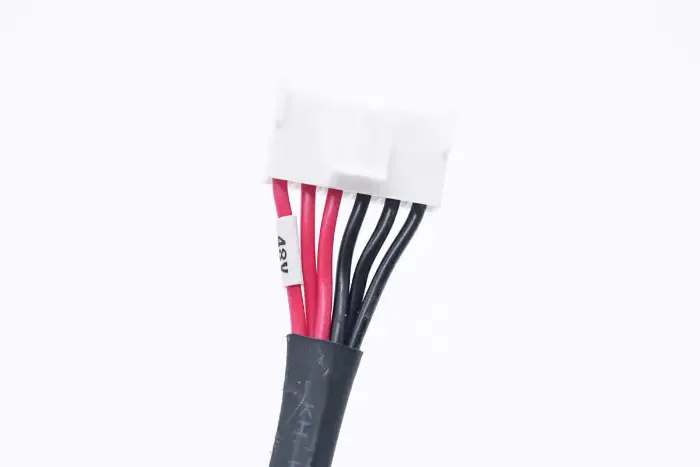 అవుట్పుట్ కనెక్టర్ యొక్క క్లోజ్-అప్: రెడ్ వైర్ అనేది పాజిటివ్ పోల్, మరియు స్లీవ్ 48V అవుట్పుట్ కోసం గుర్తించబడింది.