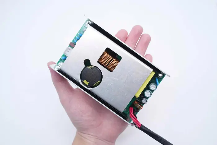 స్టార్వెల్ 300W GaN విద్యుత్ సరఫరా మాడ్యూల్ అల్యూమినియం అల్లాయ్ షెల్ను స్వీకరించింది. PCBA మాడ్యూల్ ముందు భాగంలో అల్యూమినియం అల్లాయ్ హీట్ సింక్ అమర్చబడి ఉంటుంది, మందాన్ని తగ్గించడానికి అధిక-వోల్టేజ్ ఫిల్టర్ కెపాసిటర్లు మరియు PFC బూస్ట్ ఇండక్టర్కు అనుగుణంగా ఖాళీగా ఉన్న ప్రాంతాలు ఉంటాయి.