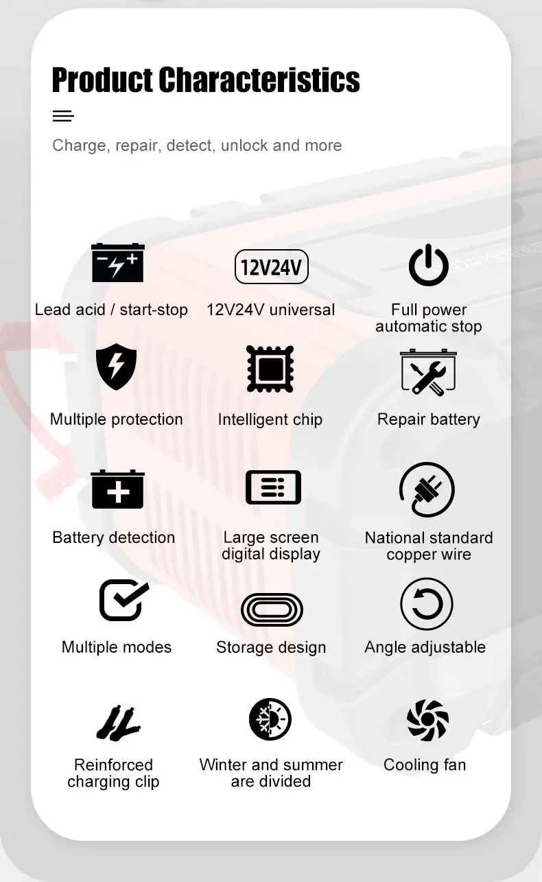 · స్మార్ట్ ఆటోమేటిక్ డిటెక్షన్: బ్యాటరీ రకాన్ని ఆటోమేటిక్గా గుర్తిస్తుంది మరియు సరైన ఛార్జింగ్ మోడ్ను వర్తింపజేస్తుంది