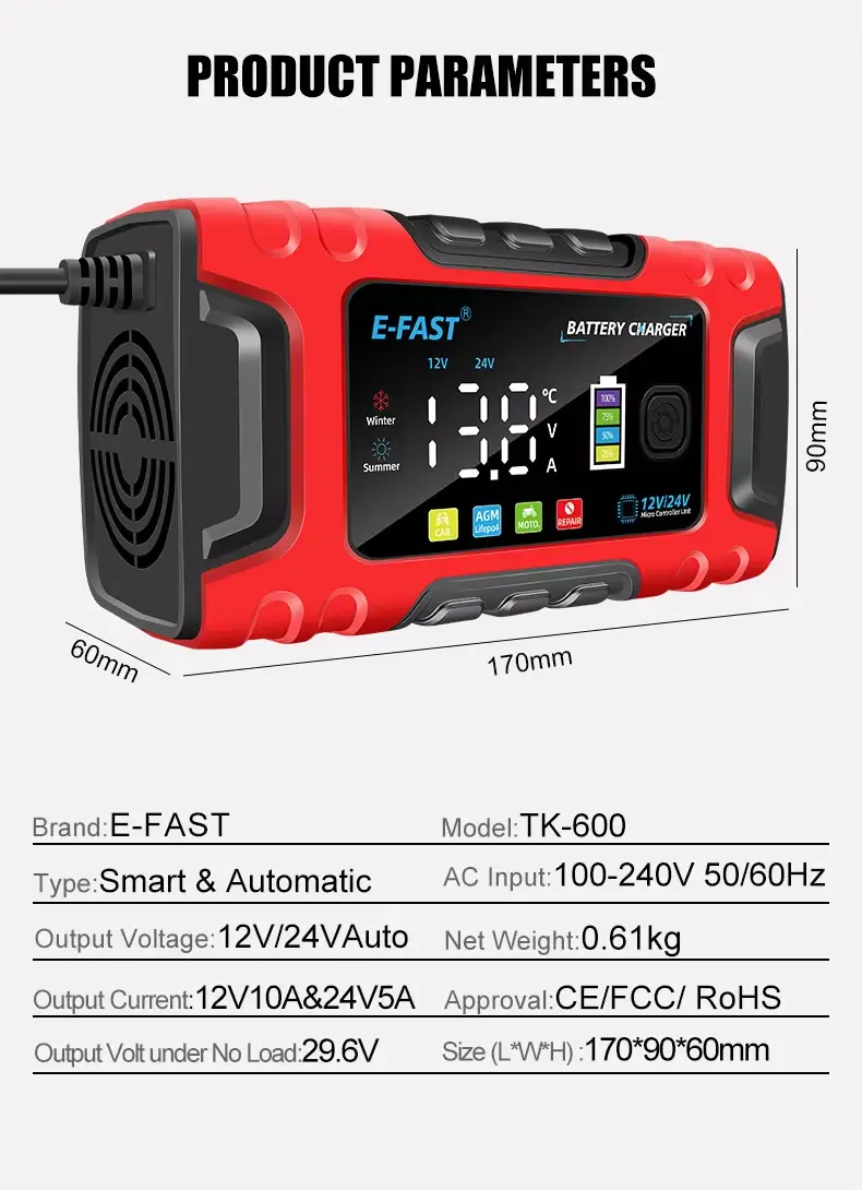 పల్స్ రిపేర్ టెక్నాలజీతో హై-క్వాలిటీ E-ఫాస్ట్ TK-600 పూర్తిగా ఆటోమేటిక్ 12V10A 24V5A లీడ్ యాసిడ్ లైఫ్పో4 కారు కోసం బ్యాటరీ ఛార్జర్ |