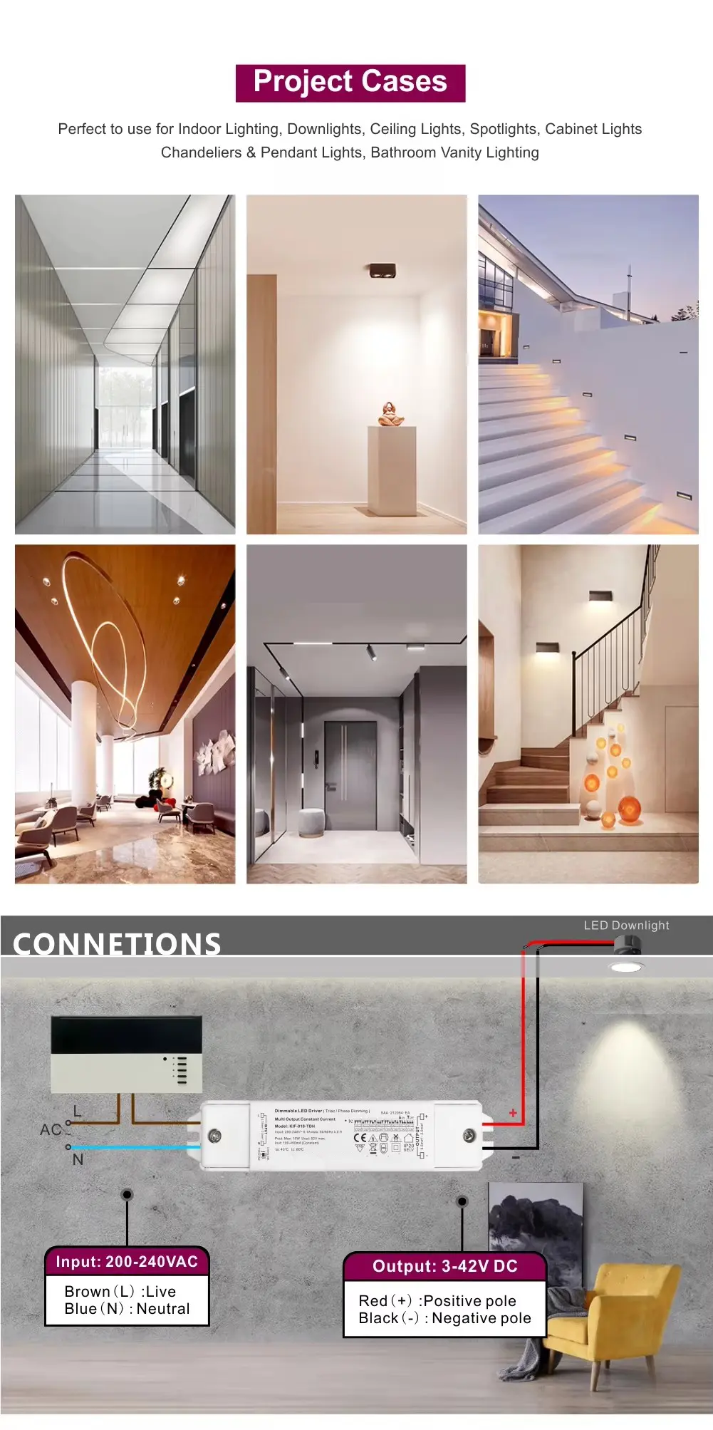 స్థిరమైన & రక్షిత స్థిరమైన కరెంట్: మీ LED మాడ్యూల్లకు ఖచ్చితమైన, స్థిరమైన కరెంట్ అవుట్పుట్ను నిర్వహిస్తుంది, ప్రస్తుత హెచ్చుతగ్గులు మరియు సర్జ్ల నుండి రక్షించడం ద్వారా స్థిరమైన ప్రకాశం, రంగు ఏకరూపత మరియు పొడిగించిన LED జీవితకాలం ఉండేలా చేస్తుంది.