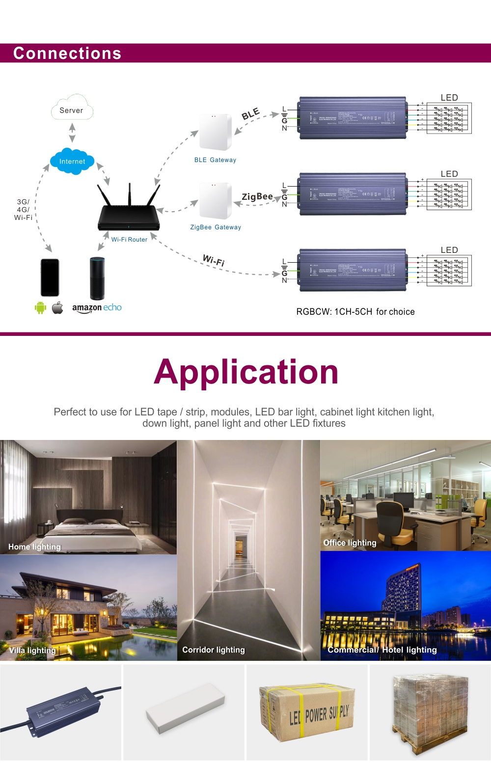 హై-ఎండ్ రెసిడెన్సెస్: లివింగ్ రూమ్ యాంబియంట్ లైటింగ్, కిచెన్ క్యాబినెట్ లైటింగ్, హోమ్ థియేటర్లు.